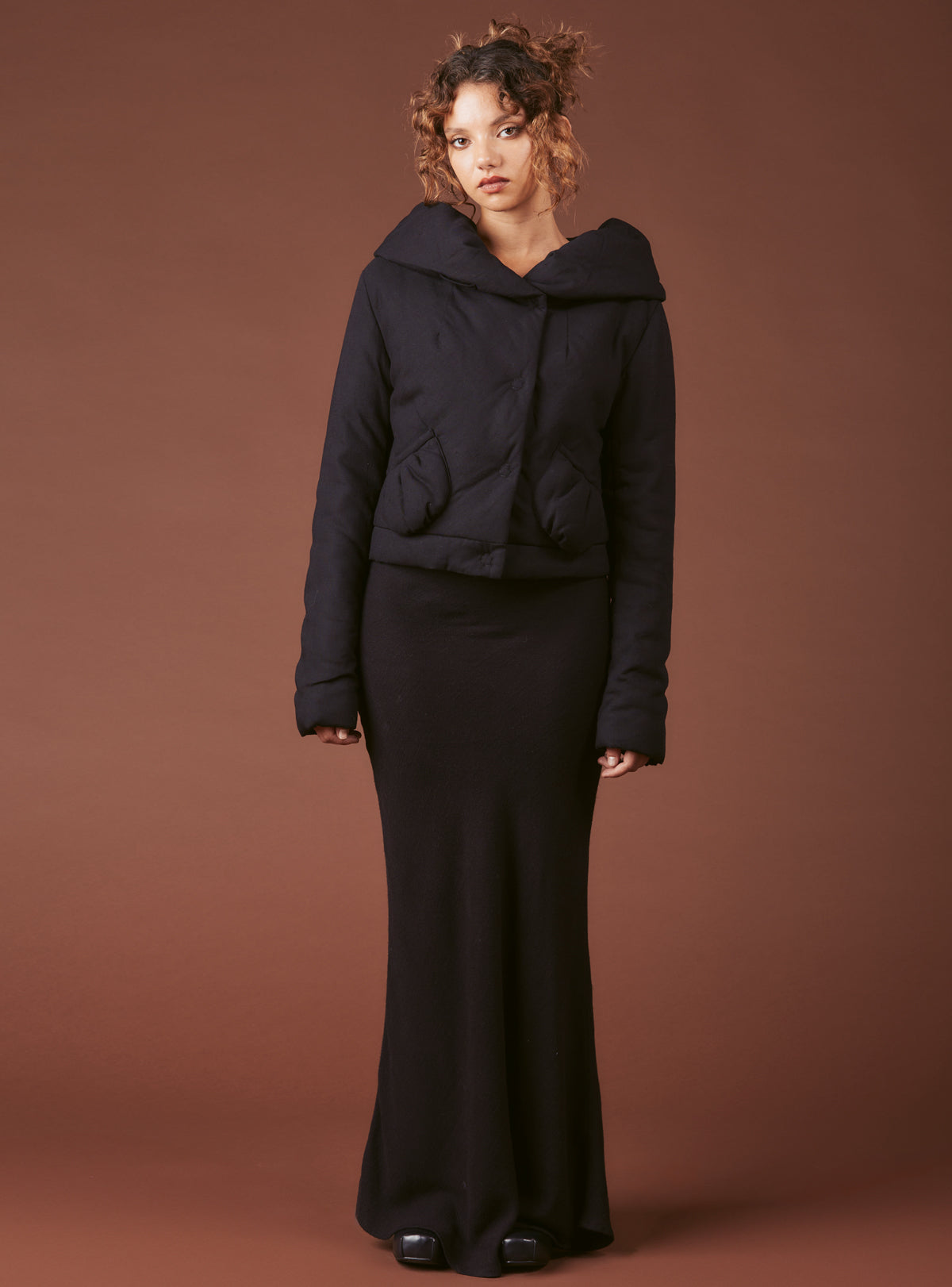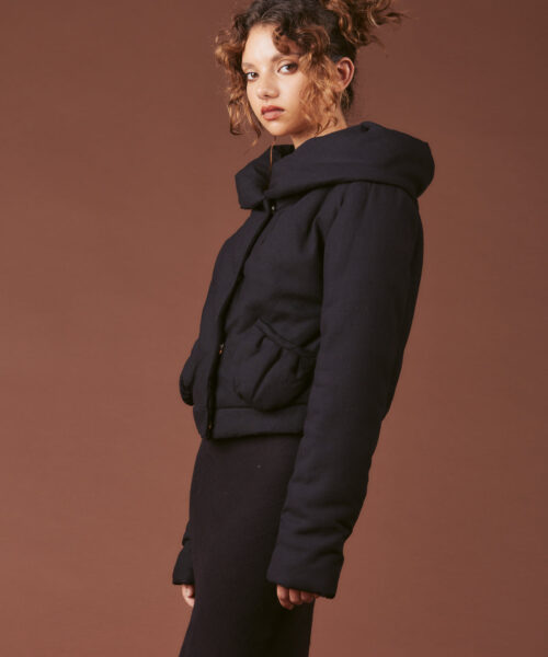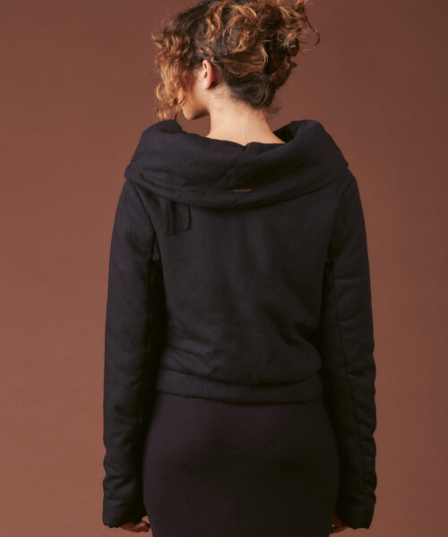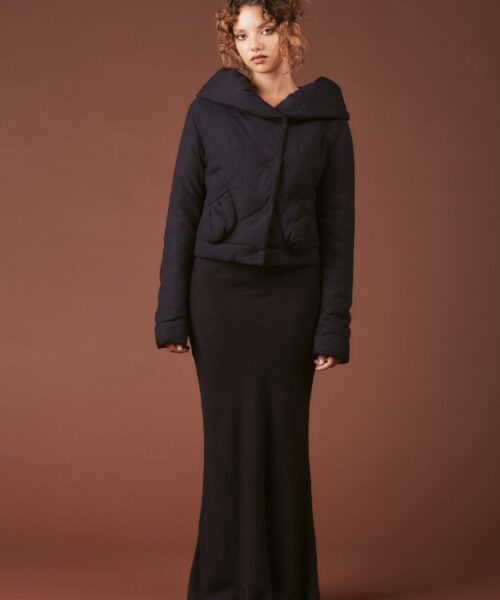The Ain Jacket is a cropped silhouette with external bubble pockets, snap button front closure and a fold-over collar that features a cinchable string detail when worn up.