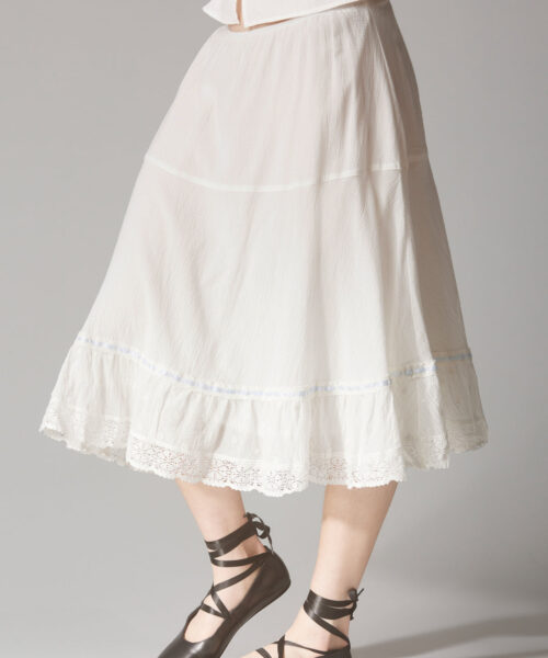 The Bobbin Skirt is a cottage core mid-length springtime skirt with an elastic waist and lace detailing at the bottom hem. Fit is true to size.