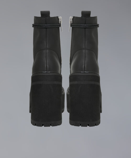 Laceup stacked platform boot insanity. Inner zipper pull for an easy in and out. 5″ heel height.