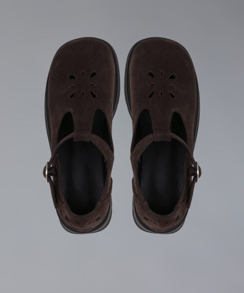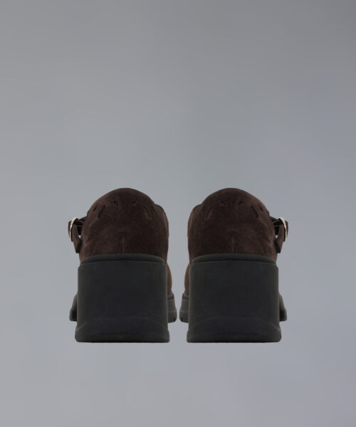 All new suede mary jane with a rubber platform sole, adjustable buckle closure, and cutout detailing on the toebox. Lined in leather and fits true to size.