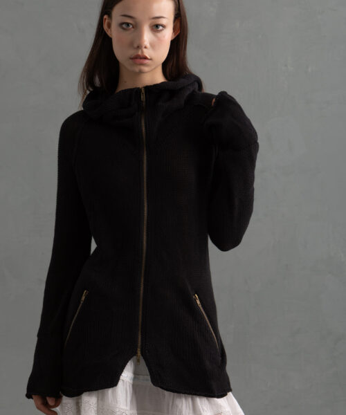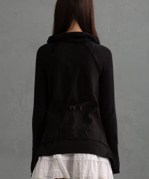 Vintage-inspired Black high-neck zip-up knit jacket in a soft 100% cotton knit featuring a two-way bronze zipper for versatile styling and a canvas deconstructed Utilitarian back piece giving Visual Kei, Goth and Minimal.
