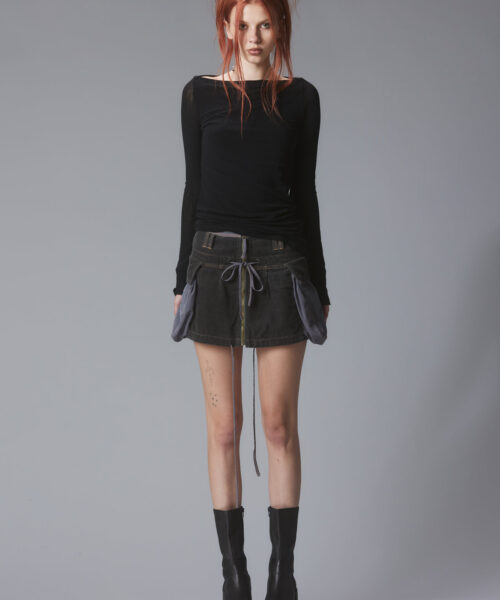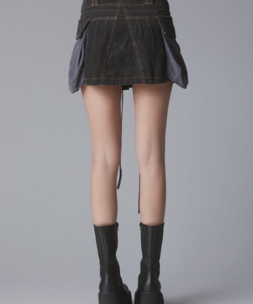 Tactical mini skirt with zipper closure and snap buttons for securing the pockets. Also has tassels for friendly styling adjustments.