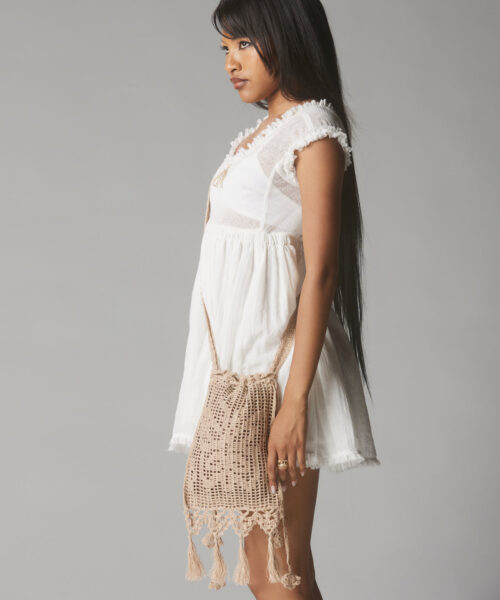 The Hook Bag is a 100% hand-crocheted bag with beautiful butterfly detailing, and magnetic snap closure. The bag is fully lined and also features cinchable pulls at the opening. The bag measures 7.5″ across x 10.5″ long and the strap measures 25.5″