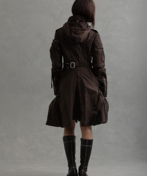 00’s archive-inspired brown trenchcoat with metal detailing throughout. Structured with intentional seams for the perfect shape. Fully lined with a drawstring hood, 6 spacious pockets, woven belt and internal elastic to exaggerate the balloon effect at the hem.