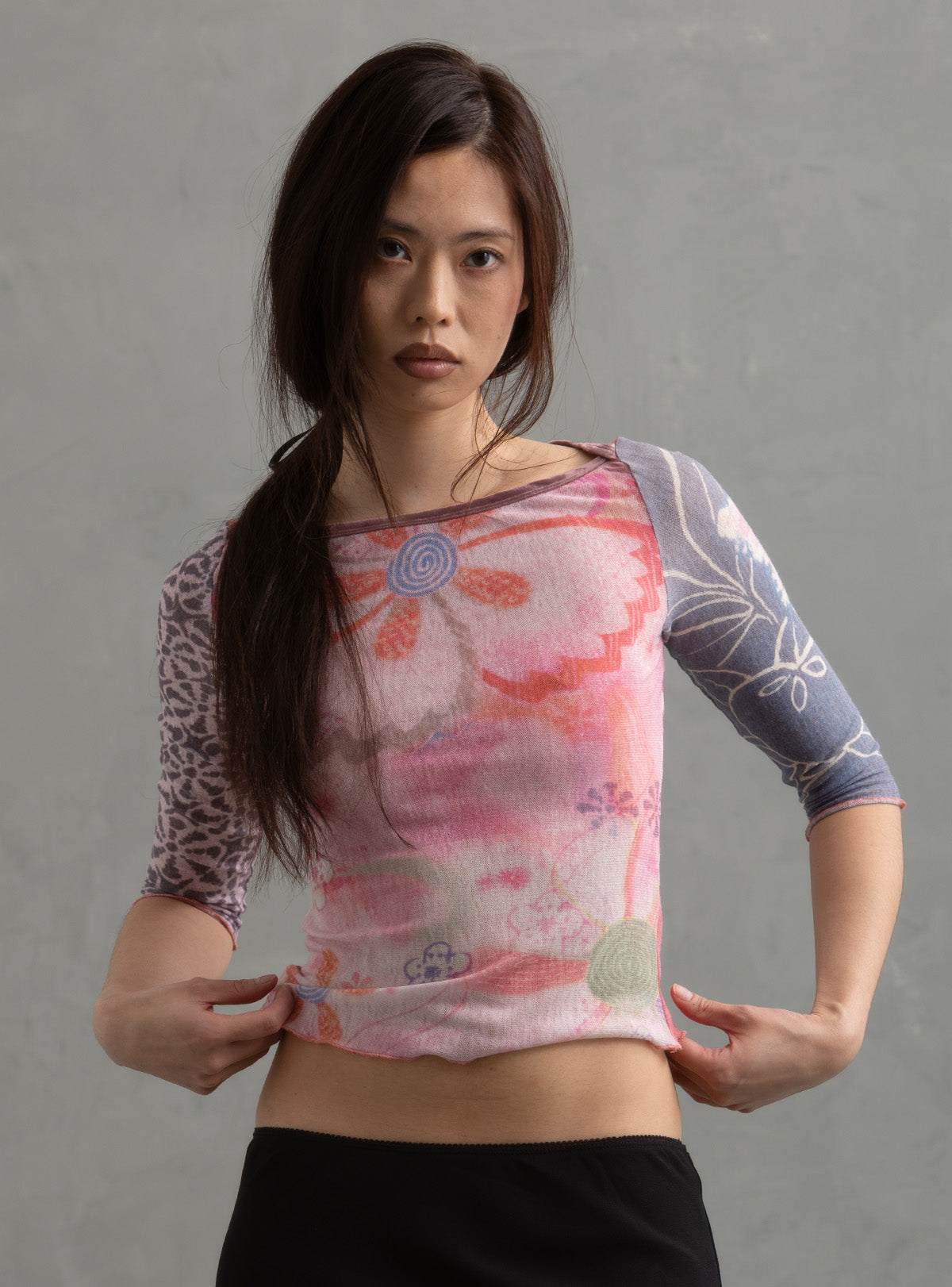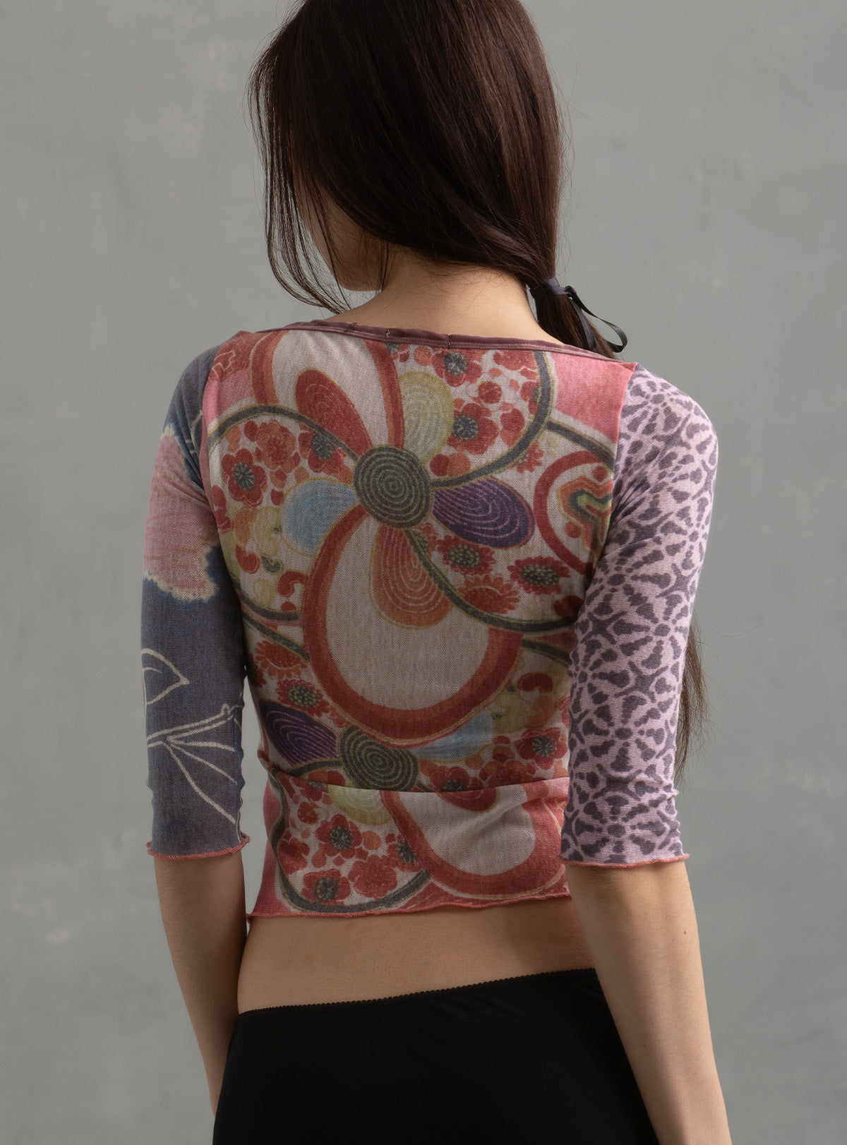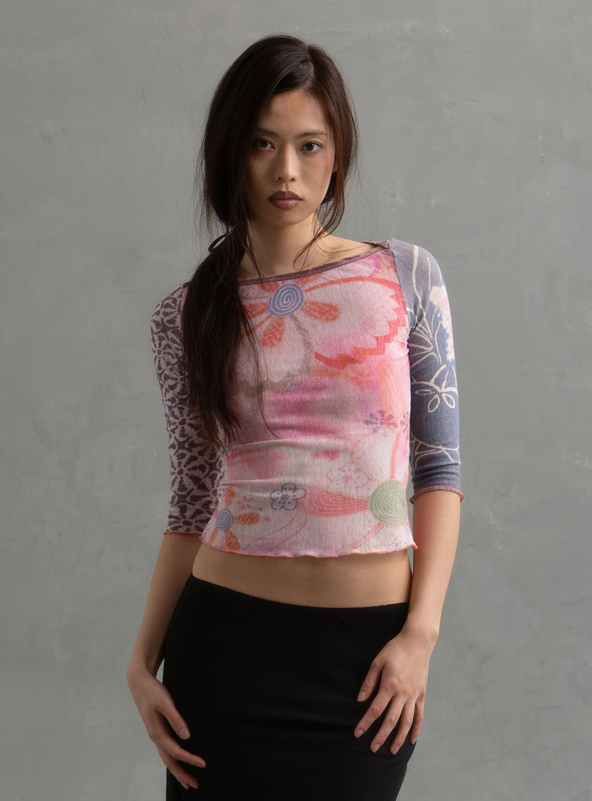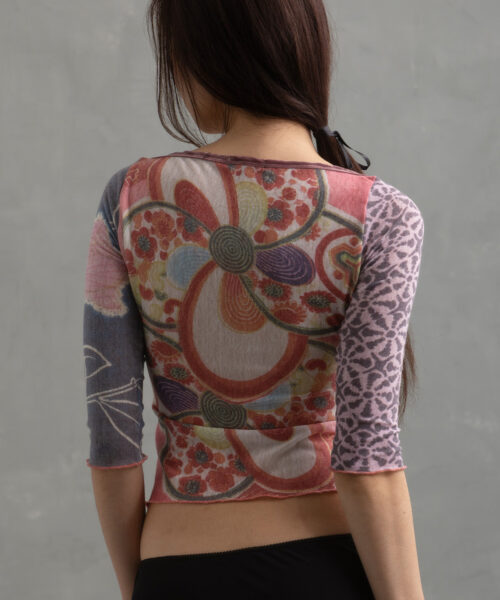 A soft mesh dream featuring artwork created from scanned vintage kimono fabric scraps sourced from flea markets across Japan. 3/4 sleeved with Lilac colored velvet binding on a square neckline.