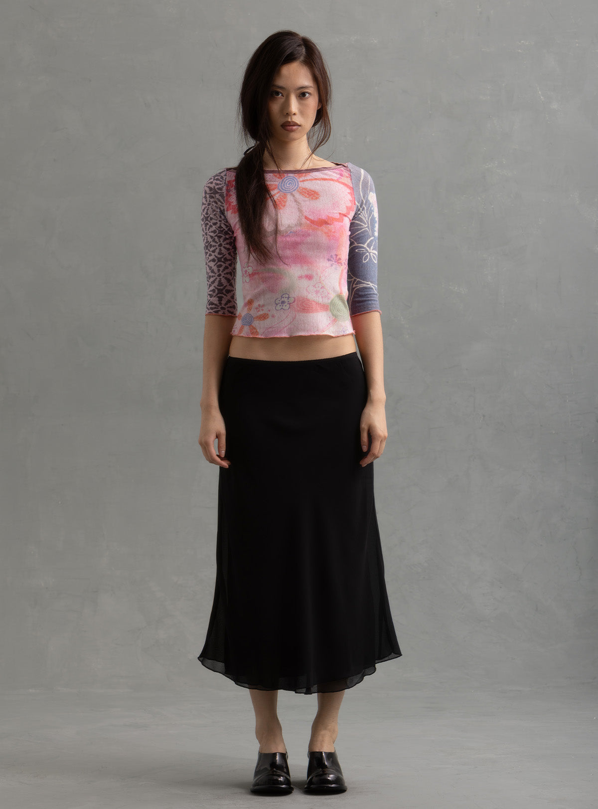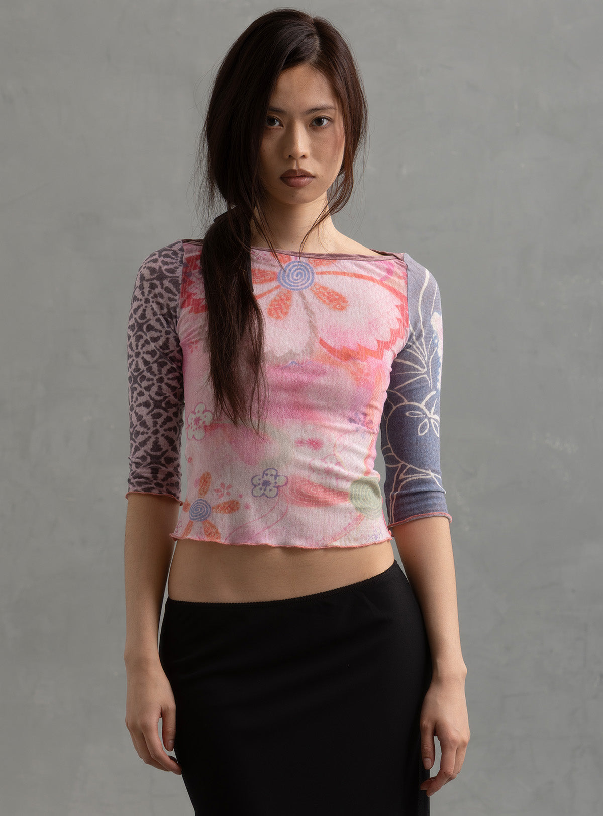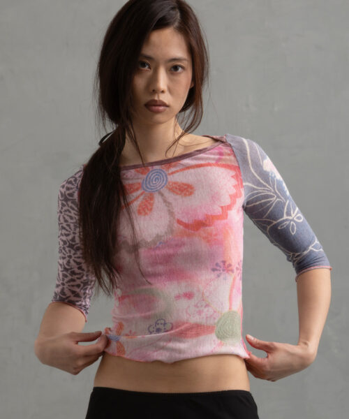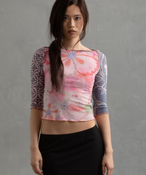 A soft mesh dream featuring artwork created from scanned vintage kimono fabric scraps sourced from flea markets across Japan. 3/4 sleeved with Lilac colored velvet binding on a square neckline.