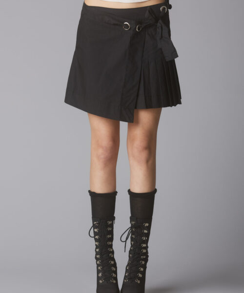 Half-pleated wrap skirt with ties and metal hardware. There is also an inner button closure for sizing adjustments and extra securing.