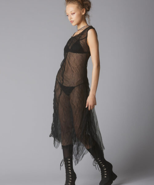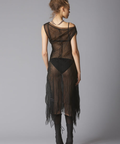 Textured off-the-shoulder dress with two layers of tulle and seam details.