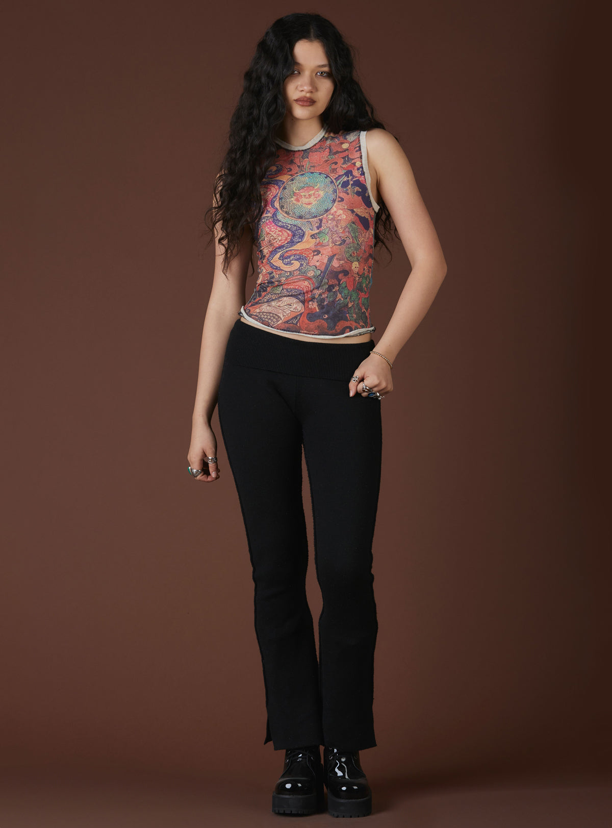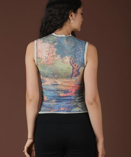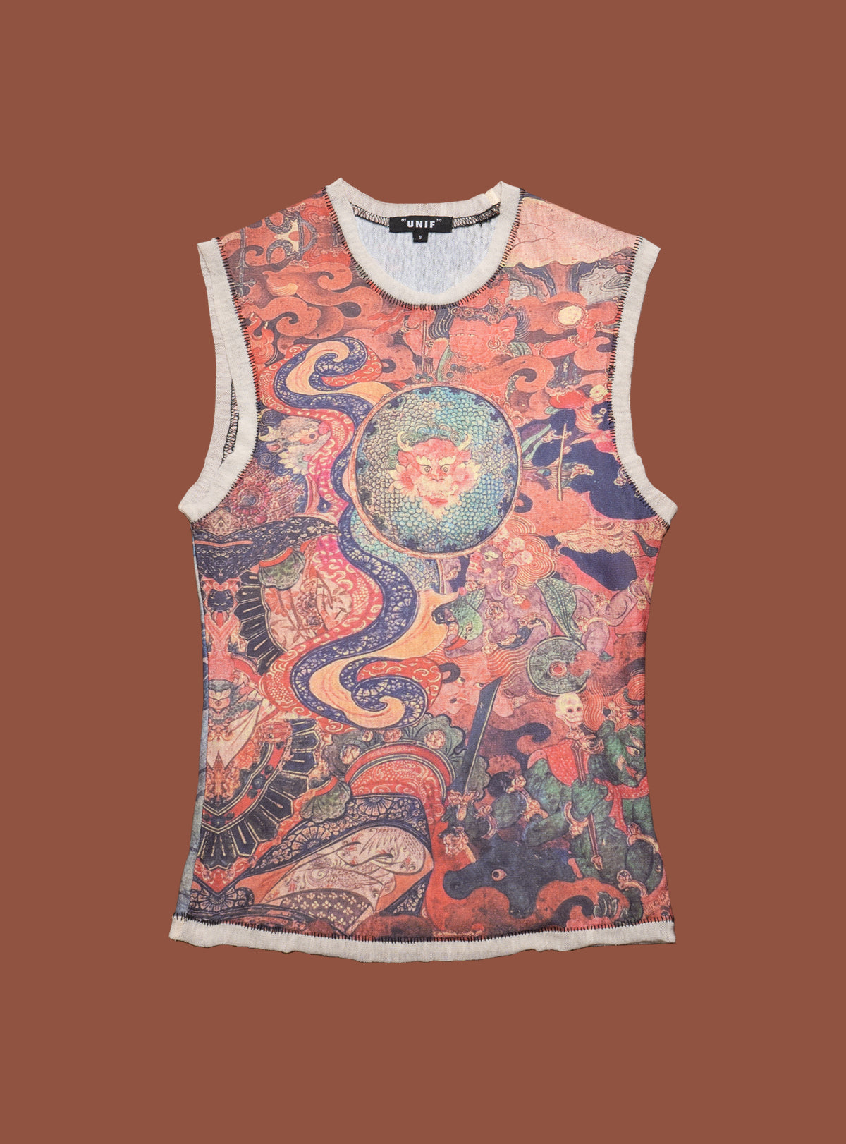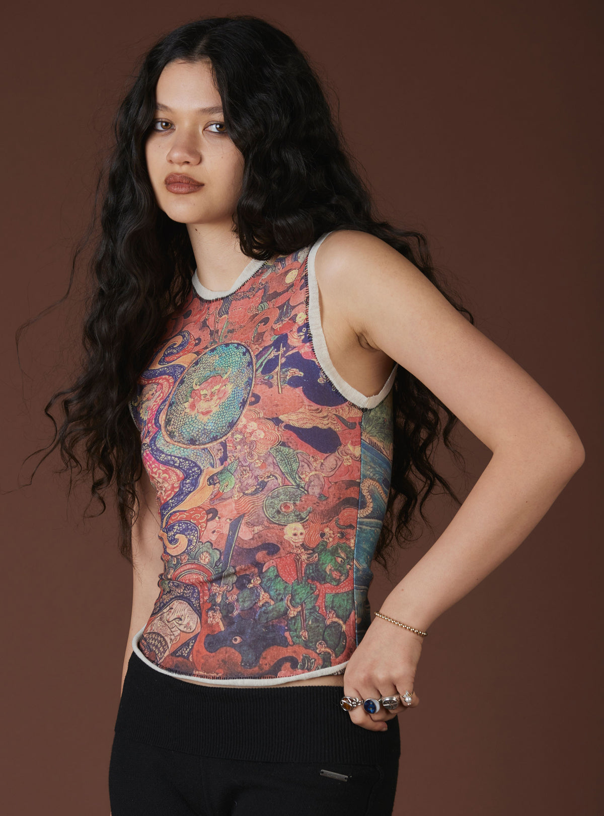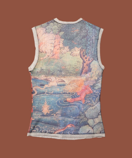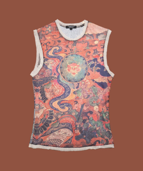 The Lore Top features dragon design detailing to ward off negativity while ushering in balance and good fortune. This vintage-inspired sleeveless tank body also features contrast detailing at the armholes and neck and raw hemlines.