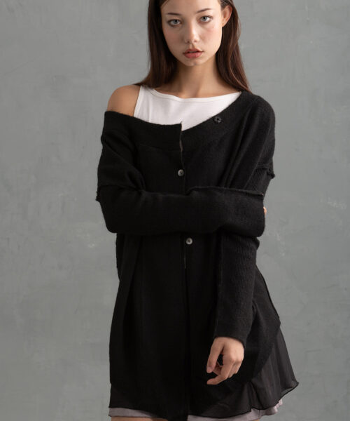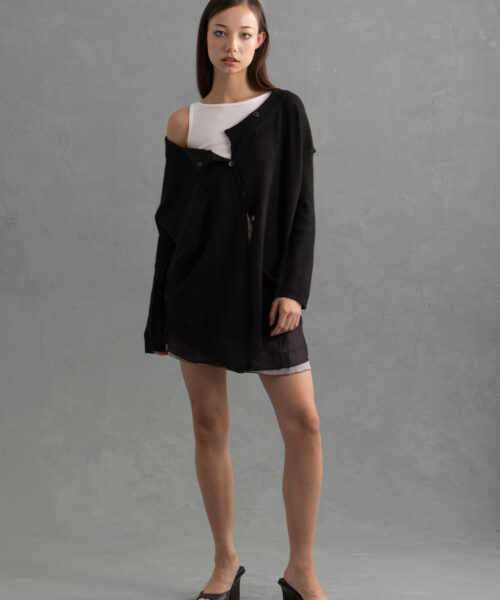 The Lusc is an oversized, long charcoal grey cardigan with a cozy, slouchy fit. It features a wide neckline with mother of pearl buttons running down the front. The knit is soft and fuzzy, and the fit is relaxed. The sleeves are long and baggy, extending past the hands for an intentionally oversized look. The hem falls to around mid-thigh, giving it a versatile length that can be styled as outerwear or layered over a dress or pants.