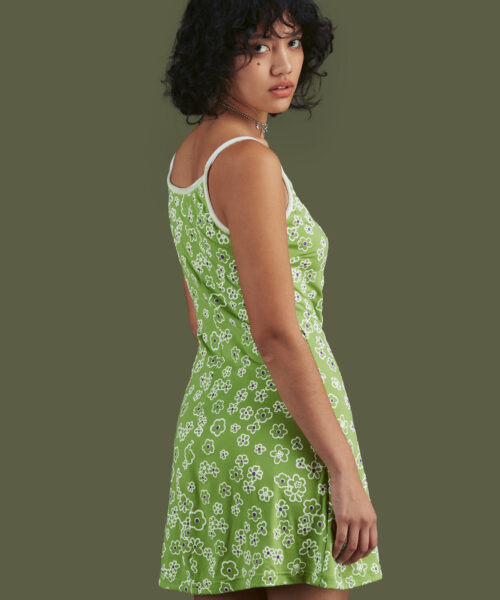 Stretchy floral dress with puff print detailing and velvet neckline, binding and straps.