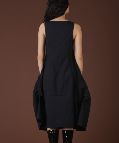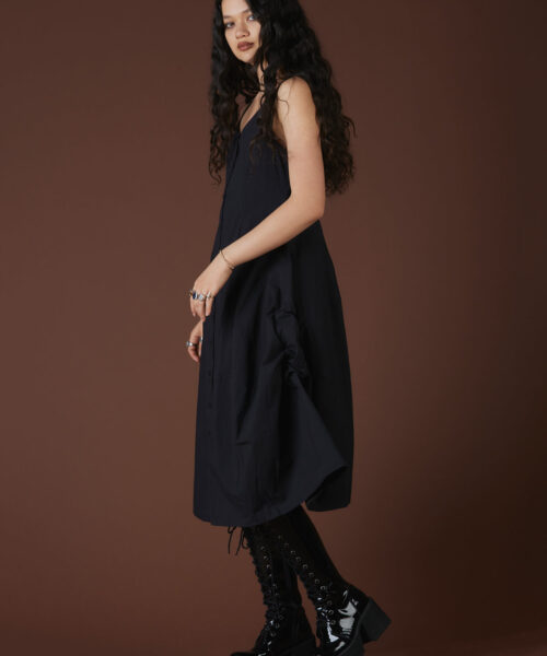 Cotton maxi dress with internal ties that, when pulled, create a ruched detailing and an asymmetrical bottom hem. Full button-up front closure. Runs true to size.