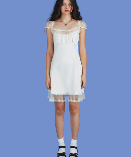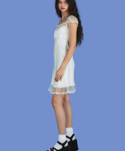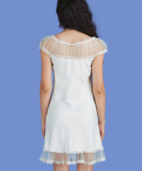 Gorgeous satin crinkle dress with tulle accent details at the shoulders, bust and bottom hem. Truly angelic.