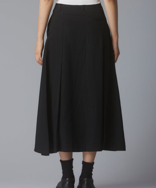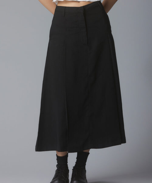 Pleated mid-rise maxi skirt with side welt pockets, belt loops, button and zipper front closure.