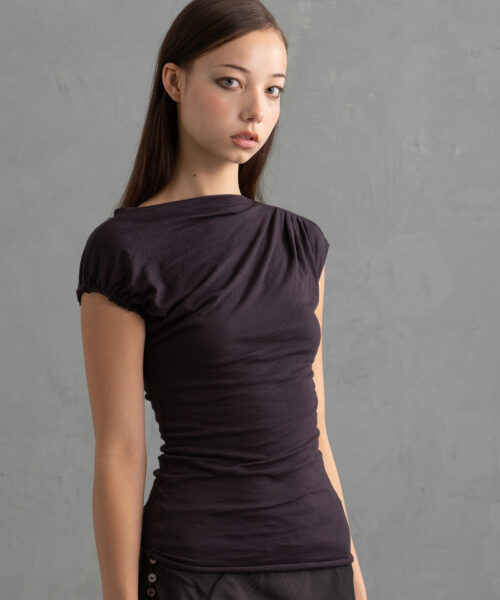 This elevated and simple top is made from an ultra-soft 100% Cotton fabric milled in the USA. It features an elegant cap sleeve on the right arm and a gentle drape across the neckline with subtle ruching on the left shoulder. This top is also offered in white and light blue.