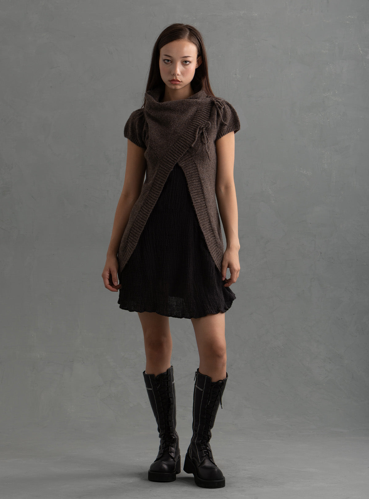 Cozy 2000’s inspired wrap-front vest in a soft dark brown knit featuring a sculptural drape neck, asymmetrical ties, semi-puff sleeves and an open front. Ideal for layering fall/winter and transitional outfits.