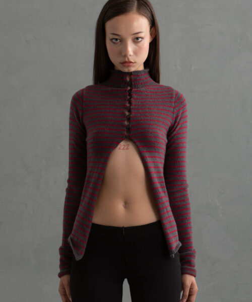 Grey and Red striped version of this open front cardigan with full length sleeves and modern-day romantic high neck. Sultry, sleek and minimal. Perfect for layering or not. Paired with the Bobbin Mini Skirt.