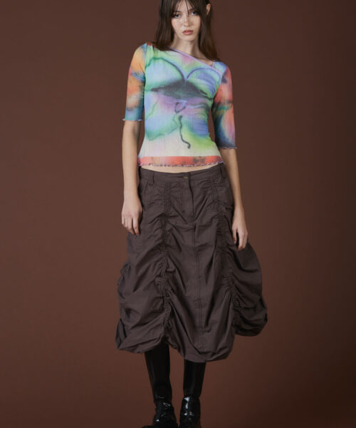 A collaborative piece made with the illustrations of @mf__bae. These works are inspired by the sensuality of nature, embracing slowness, and subtle beauty of transitions. Made with a printed mesh material, 3/4 length sleeve, and Lilac detailing, it’s a perfect transition into your Spring wardrobe.