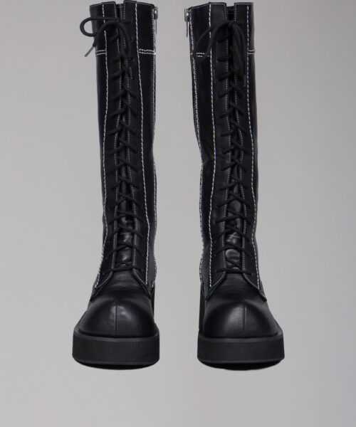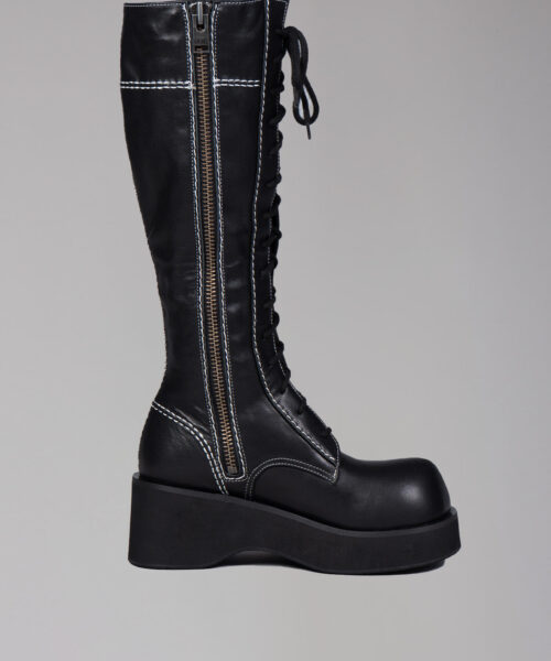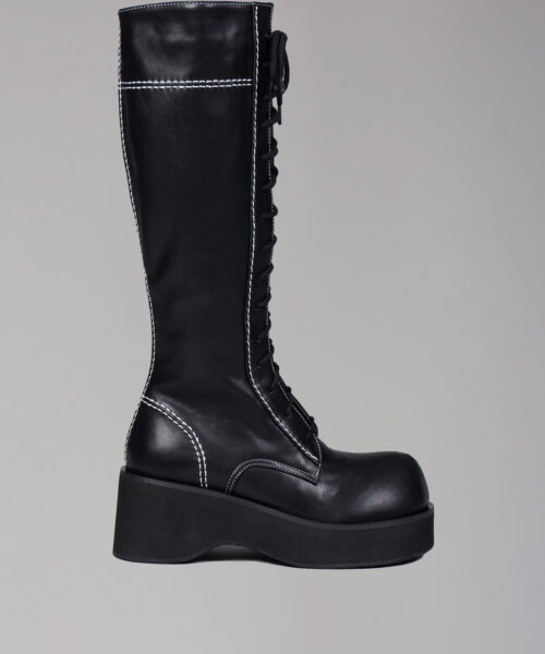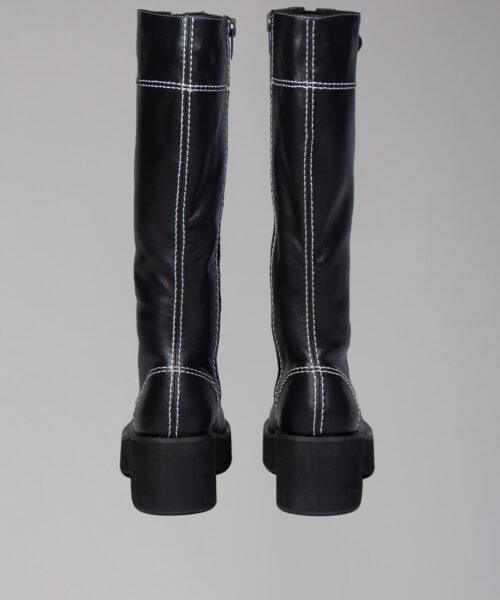 Vintage inspired super comfortable knee-high combat boot with contrast stitching and easy access zip on the inside. Offered in a matte black leather.