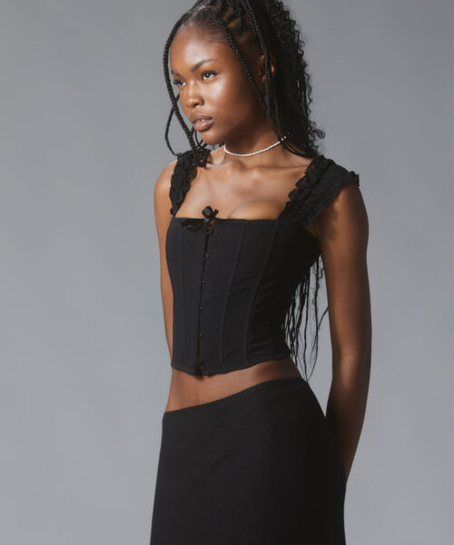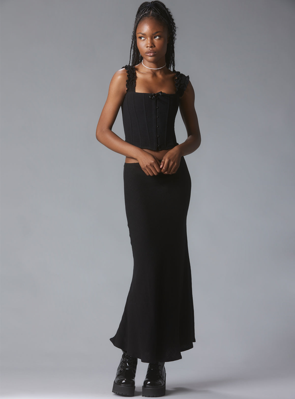 The linen version of the Posey top. Bustier-style top with textured shoulder strap detailing and a bow at the neckline. Model is 5’10” and wearing a size S