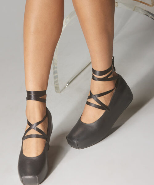 The Prima is a leather ballet-inspired shoe with a hidden platform. Lace ribbon for wrapping around the ankle. Fit is true to size.