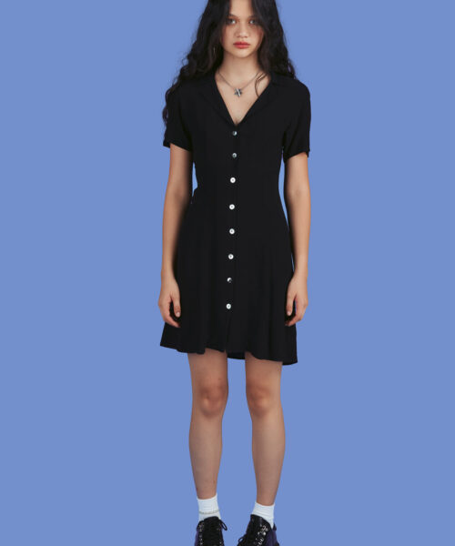 Beautiful rayon dress with mother of pearl front button closure. Material is light, flowy and slightly sheer. Fit is true to size.