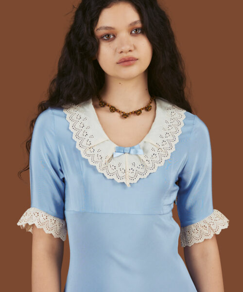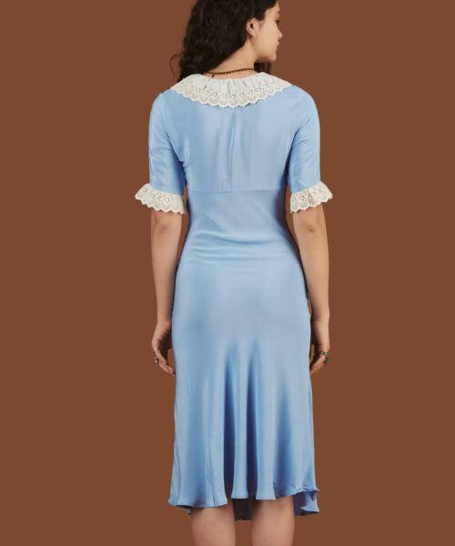 The Rora Dress is a whimsical full-length rayon dress featuring lace detailing at the collar and cuffs.