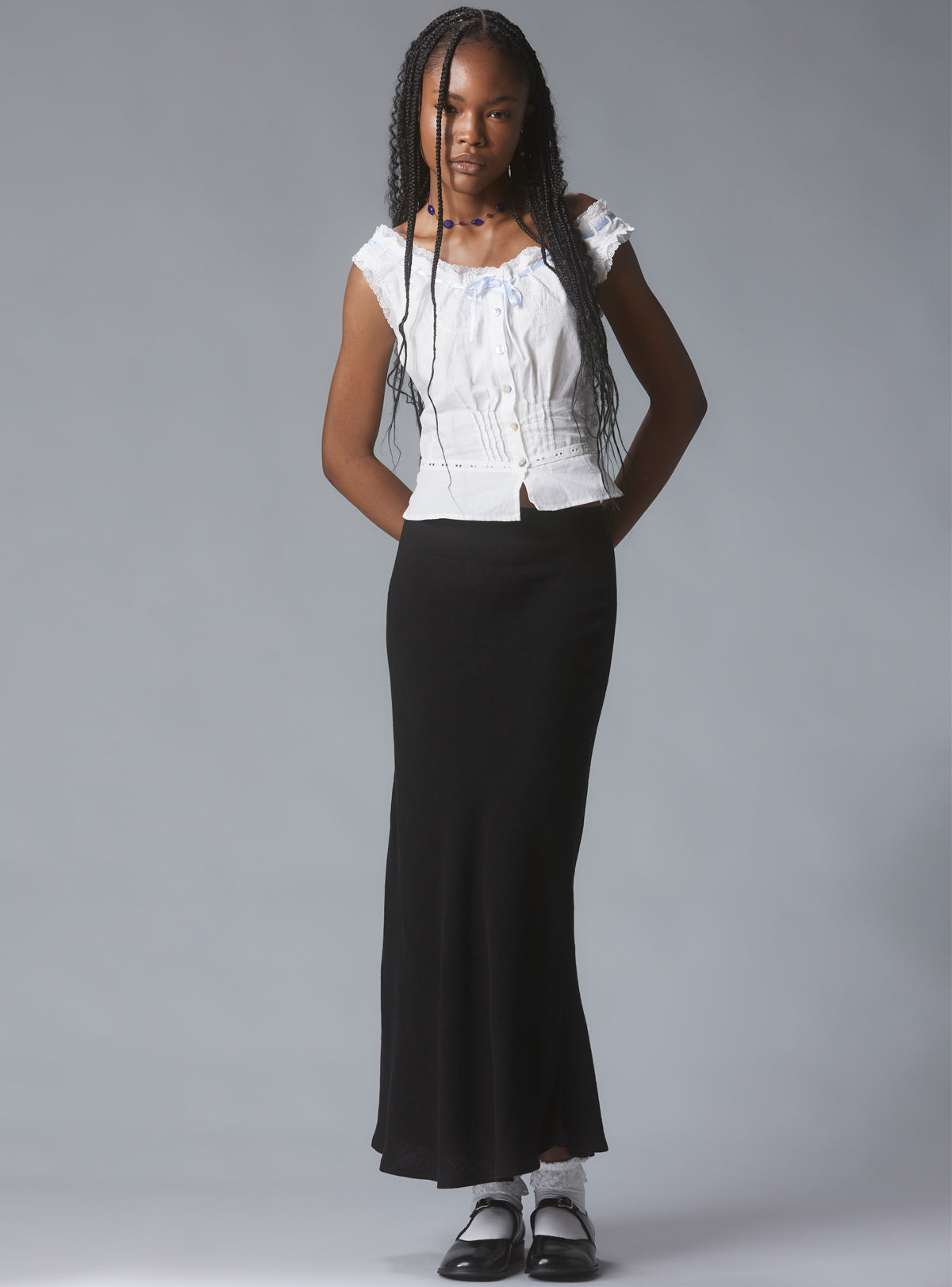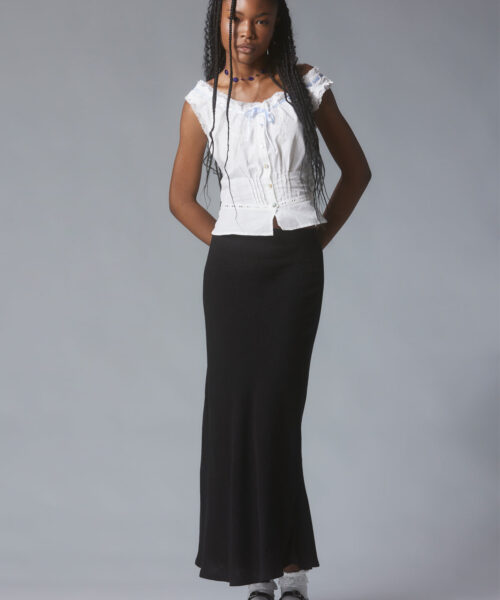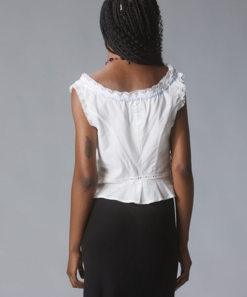 The Rue Top is a button-up blouse featuring ruffle detailing along the neckline, tonal embroidered applique throughout, and contrast satin ribbon at the bust.
