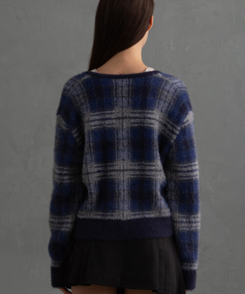 Fuzzy, over-sized, supersoft plaid cardigan with a boxy fit. Features include two front pockets, elongated sleeves and a UNIF flag tag at the bottom of pocket seam.
