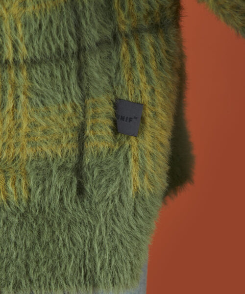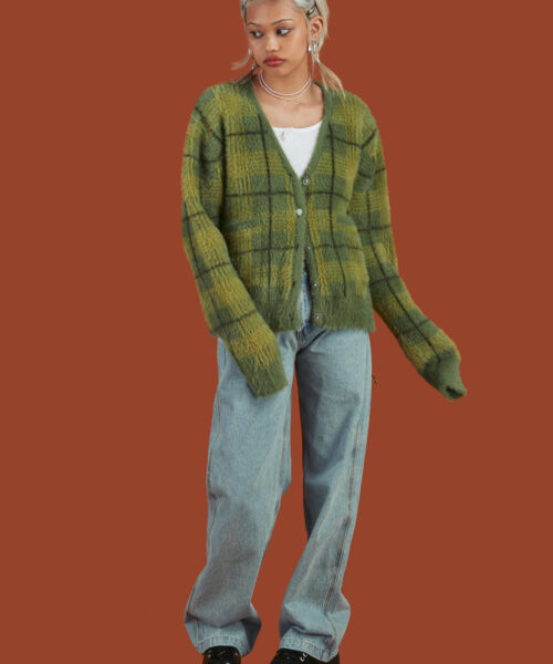 Fuzzy, over-sized, supersoft plaid cardigan with a boxy fit. Features include two front pockets, dropped shoulders, elongated sleeves and a UNIF flag tag at the