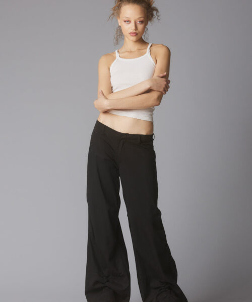 The Vast Pant is a wide-leg, low-rise tech pant with pull-tie ruching detail at the front bottom. Also features back patch pockets beneath the yoke and a zip fly. Take your normal size they are very low-rise and will rest on the low hip.