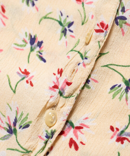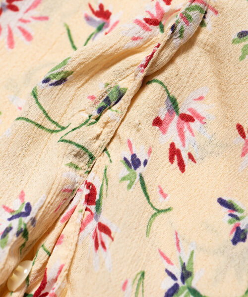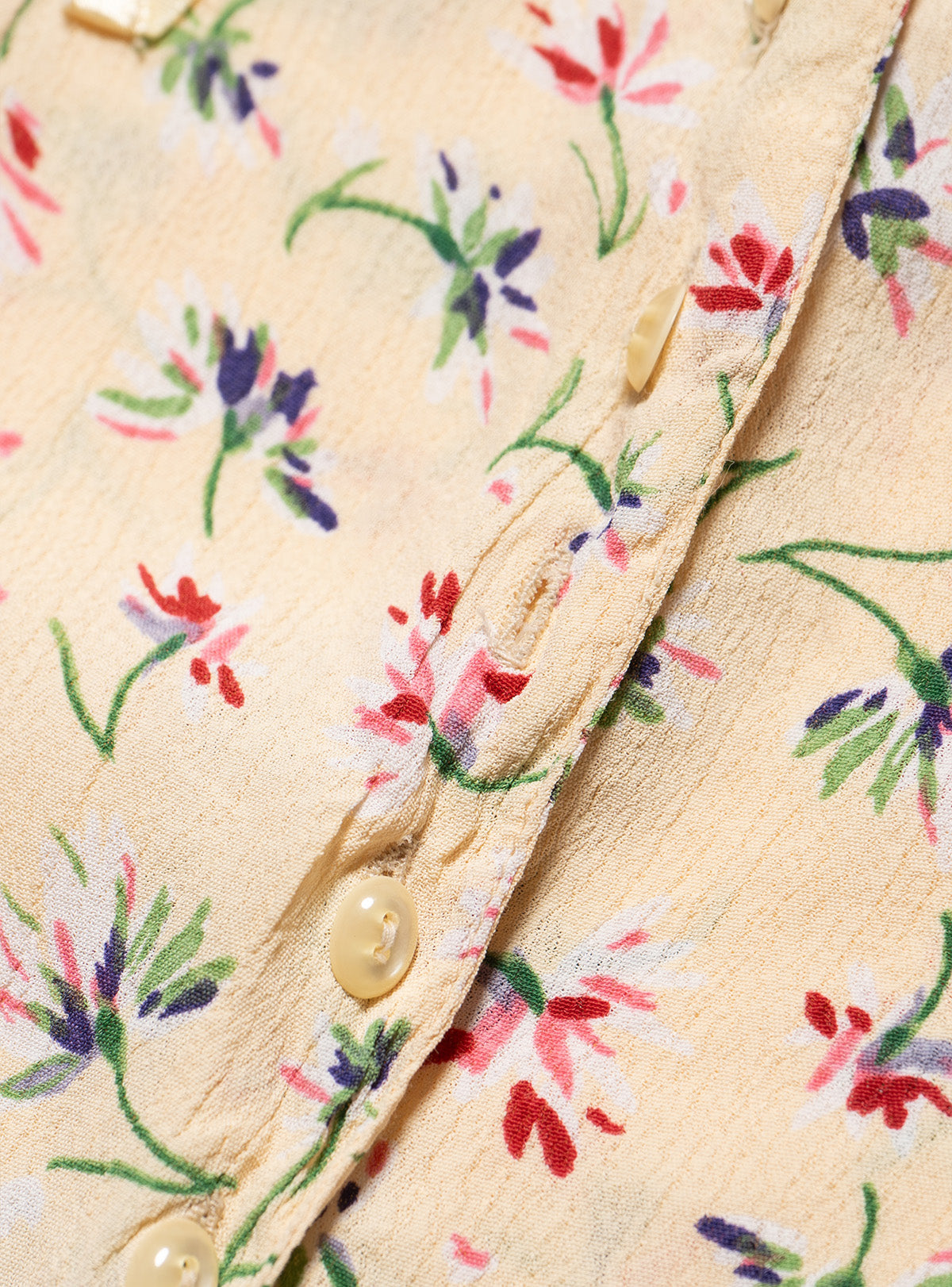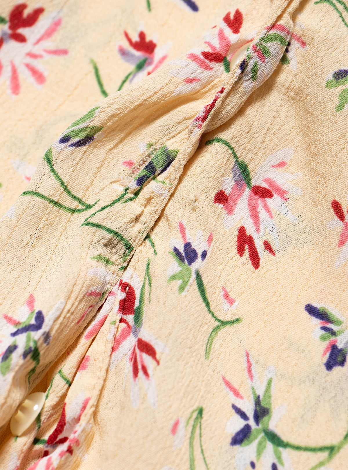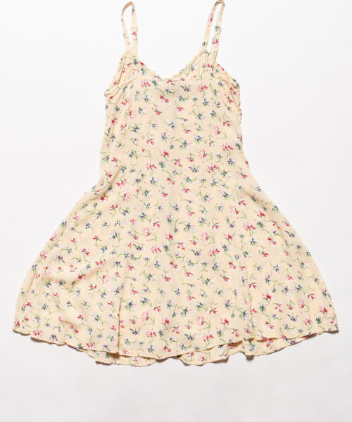 90’s floral print, gauzy fabric, mini dress with satin tie detailing and open button front. Would look perfect with a fuzzy cropped cardigan.