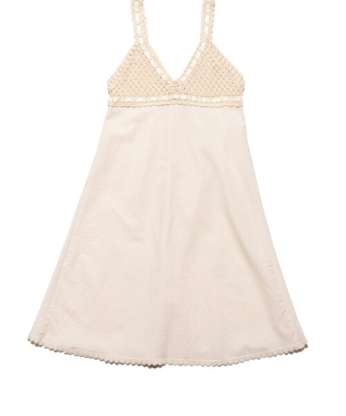 Ethereal and effortlessly elegant, this midi dress features a beautifully handcrafted crochet bodice with delicate ribbon detailing, adding a soft, feminine touch. The empire waistline creates a flattering silhouette, flowing into a lightweight 100% cotton skirt. Designed in a true cream tone, this dress is finished with a subtle trim on the hem for a polished, vintage-inspired look.