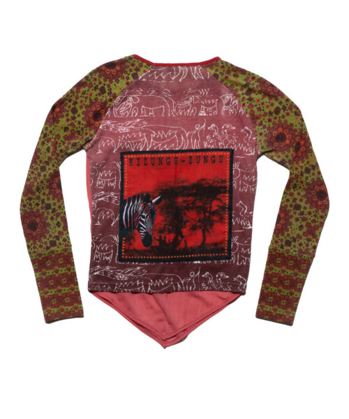 Very cool block printed top featuring appliqued patches and hand bead work. Peaked bottom hem. The front is a double layered synthetic sheer material. The sleeves and back panel are poly rib with stretch. No label.
