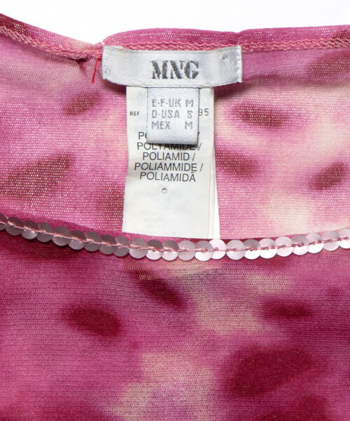 Sheer top. Sequins neck detail. Finished edges.
