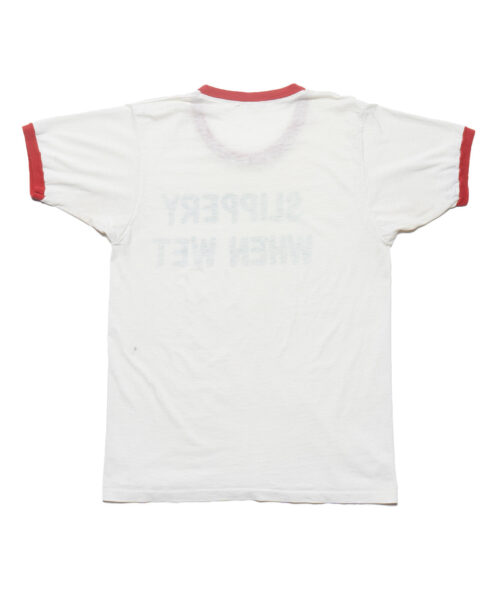 Very thin and buttery soft poly/cotton ringer tee. Tubular construction, so no side seams. Great single pass, double color, gradient print on front.
