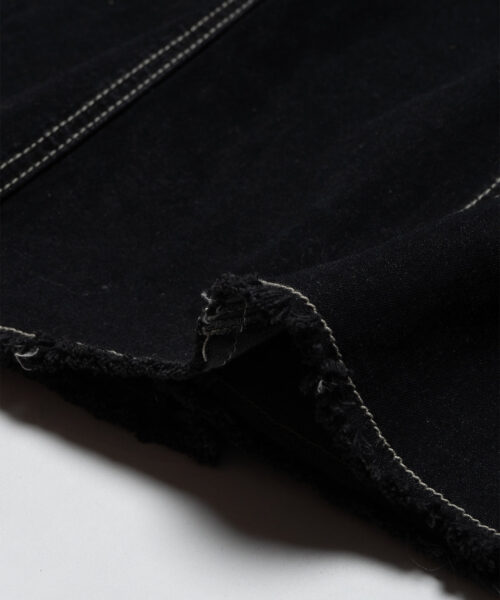 Lightly washed Black denim long skirt. Lots of contrast stitch detail. Frayed hem, custom shank button, zipper fly, and no pockets.