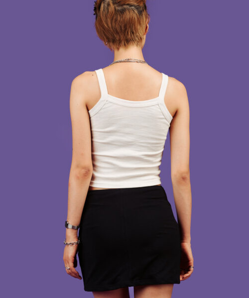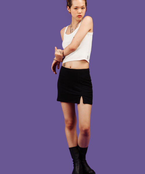 X skirt features a mid-rise fit that sits right above the hip. Featuring front side slit and a bit of stretch for a comfy fit and feel.