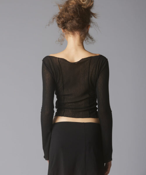 Wide neck mesh top. Exposed seams and diagonal lace detail on the front