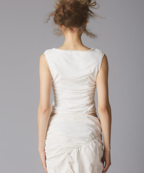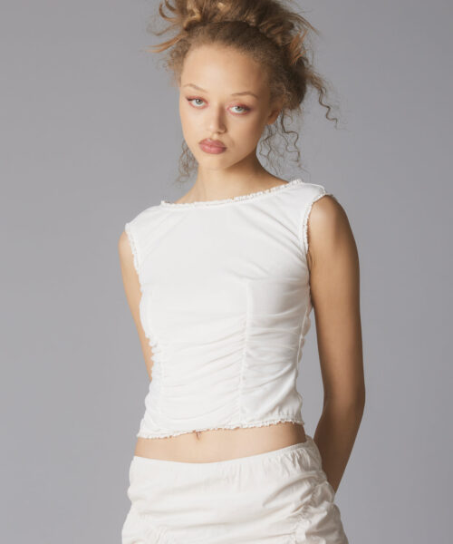 Wide neck top with textured body and a ruffled trim.