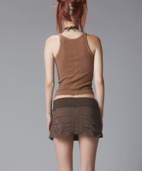 The Borg is a miniskirt with a wide, elastic waistband and a ruched tech fabric. Fit is true to size.