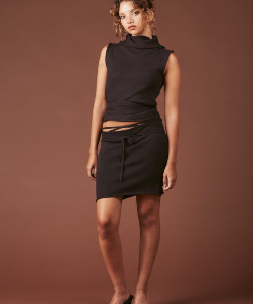 Knit cutout dress with slouchy mock neck and adjustable waist tie detailing. Raw hems throughout and metal buttons at the back of the waist. Material is stretchy for a cozy fit and feel.