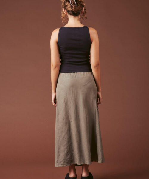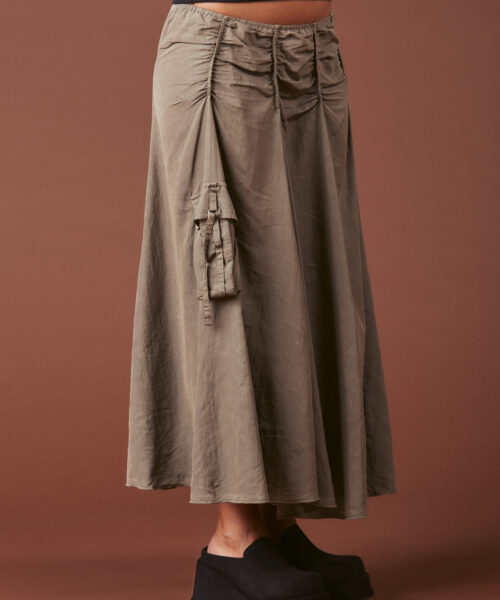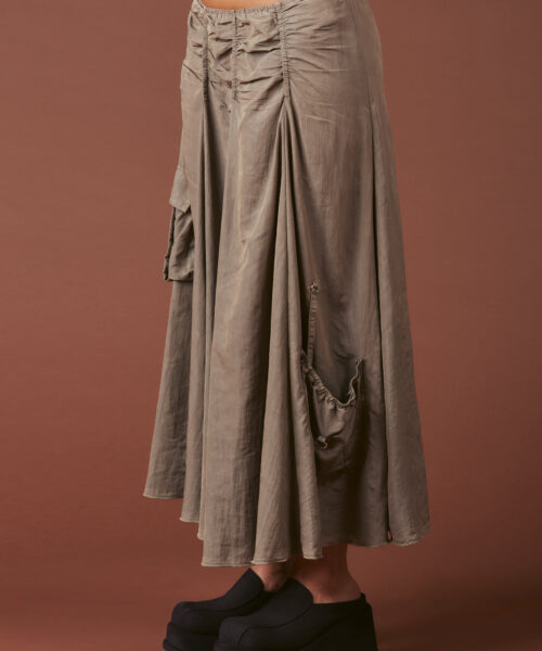 Airy maxi skirt with drop pockets and permanent ruching details. Metal hardware closure for the pockets, elastic waistline with a zipper closure