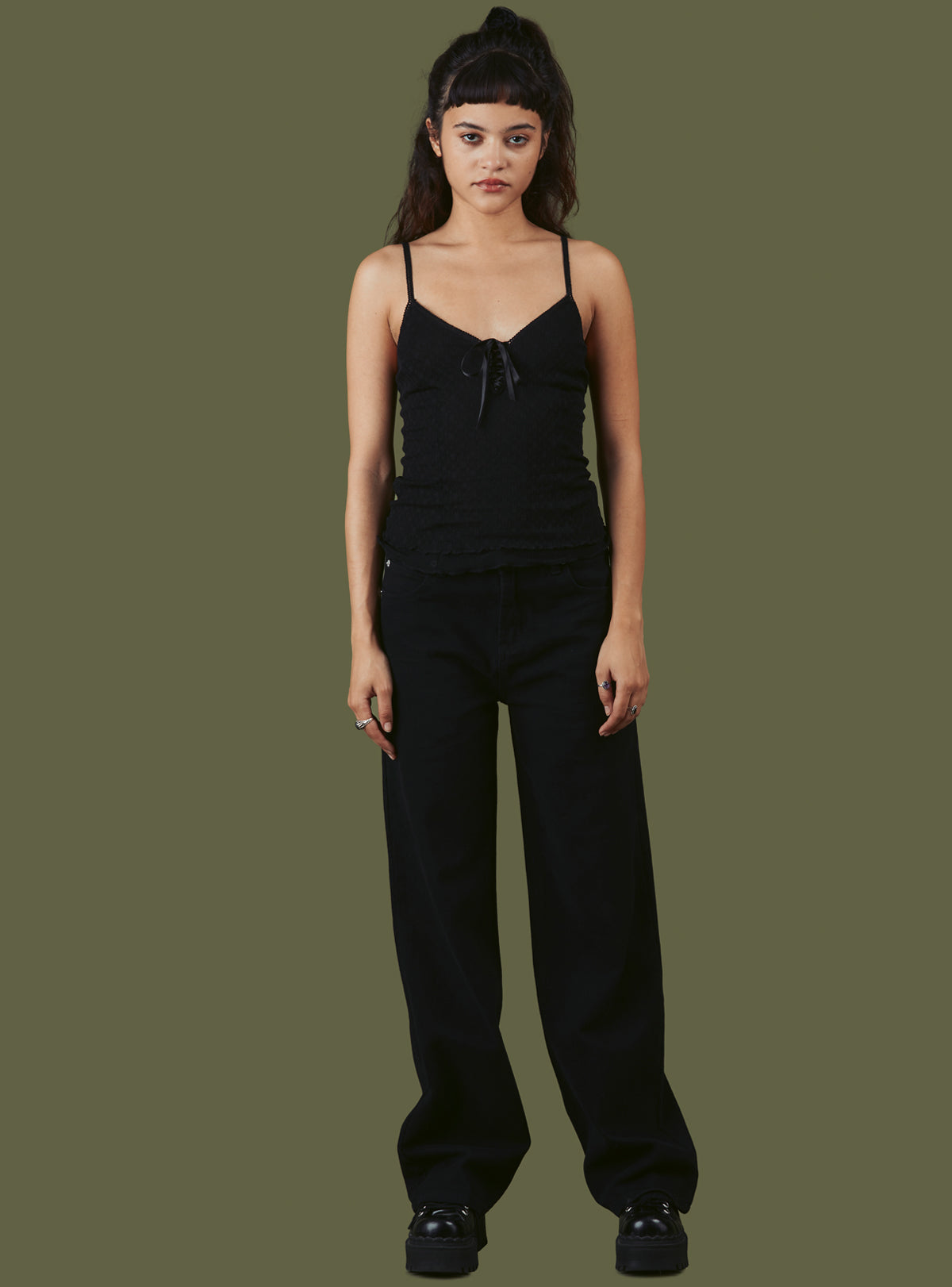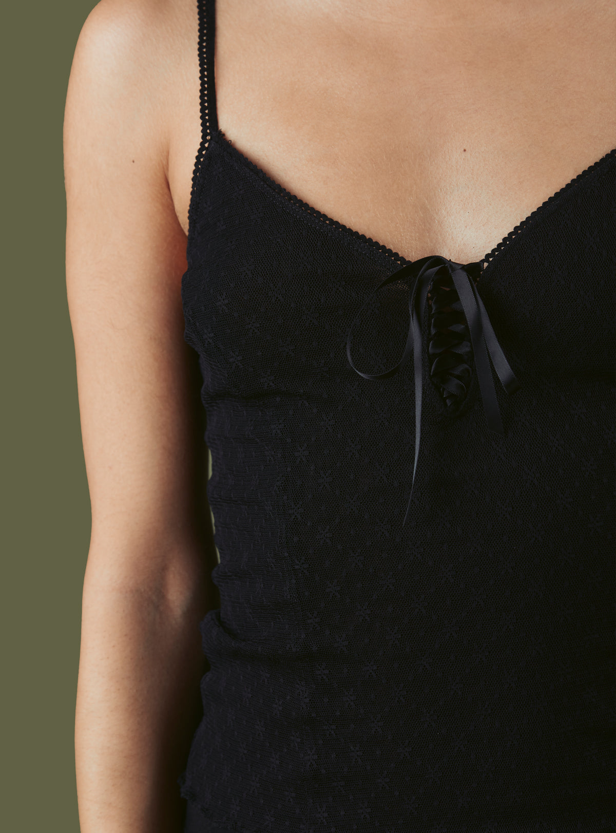 Double layer mesh tank top with adjustable straps and a center lace up front.