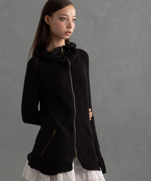 Vintage-inspired Black high-neck zip-up knit jacket in a soft 100% cotton knit featuring a two-way bronze zipper for versatile styling and a canvas deconstructed Utilitarian back piece giving Visual Kei, Goth and Minimal.