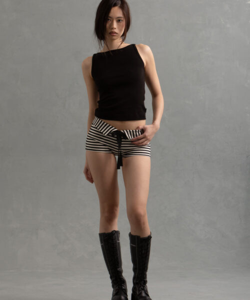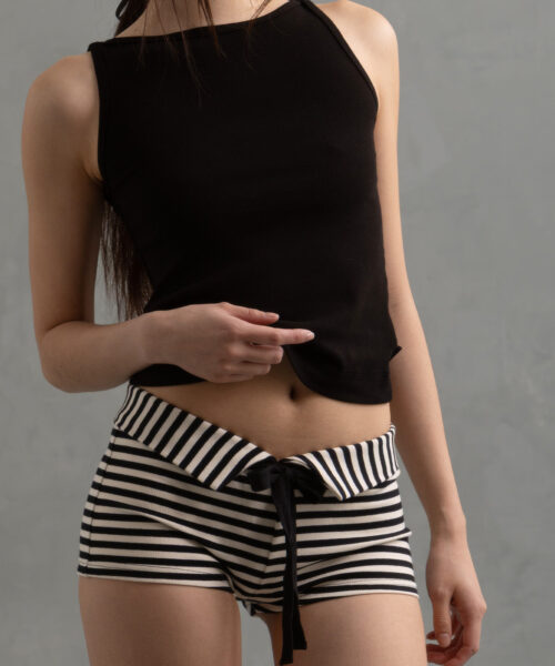 Early 2000’s inspired ultra-short low-rise micro shorts in a black and white stripe. Made from a soft fabric that isn’t too stretchy so it hugs well and features a decorative fold over waist band with a twill tie.
