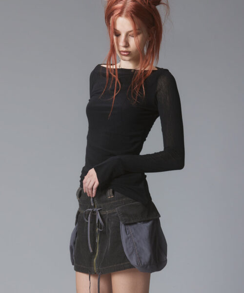 Tactical mini skirt with zipper closure and snap buttons for securing the pockets. Also has tassels for friendly styling adjustments.