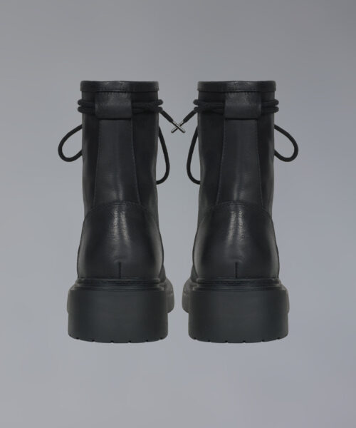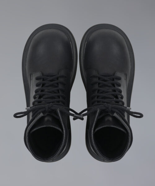The perfect boot doesn’t exi… The Hagen Boot is a combat lace-up boot with a supple leather upper and a solid rubber sole. Features include elongated laces for a wrap-around at the top and a rounded toebox. Sole measures .5″ at the front to 1.5″ at the heel.