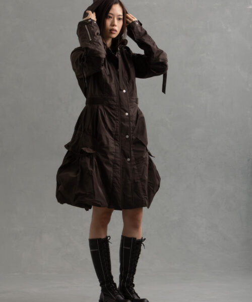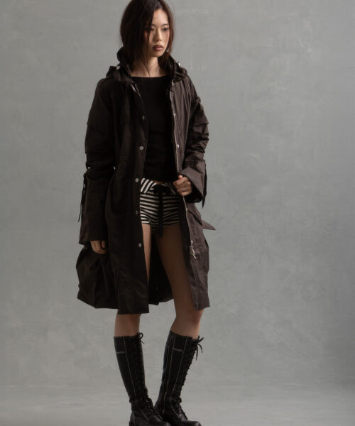 00’s archive-inspired brown trenchcoat with metal detailing throughout. Structured with intentional seams for the perfect shape. Fully lined with a drawstring hood, 6 spacious pockets, woven belt and internal elastic to exaggerate the balloon effect at the hem.