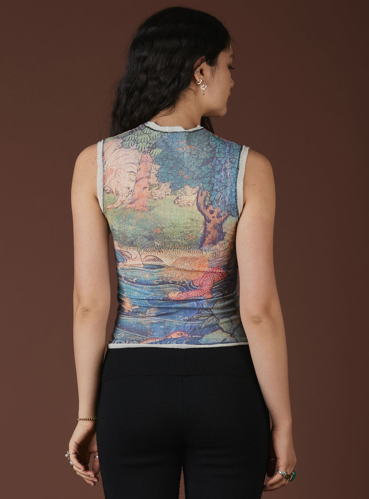 The Lore Top features dragon design detailing to ward off negativity while ushering in balance and good fortune. This vintage-inspired sleeveless tank body also features contrast detailing at the armholes and neck and raw hemlines.